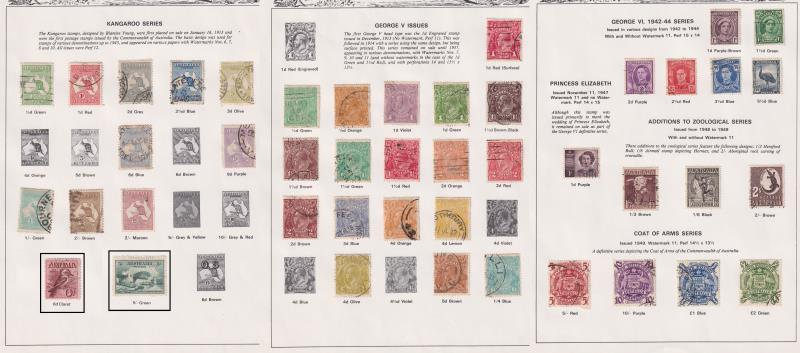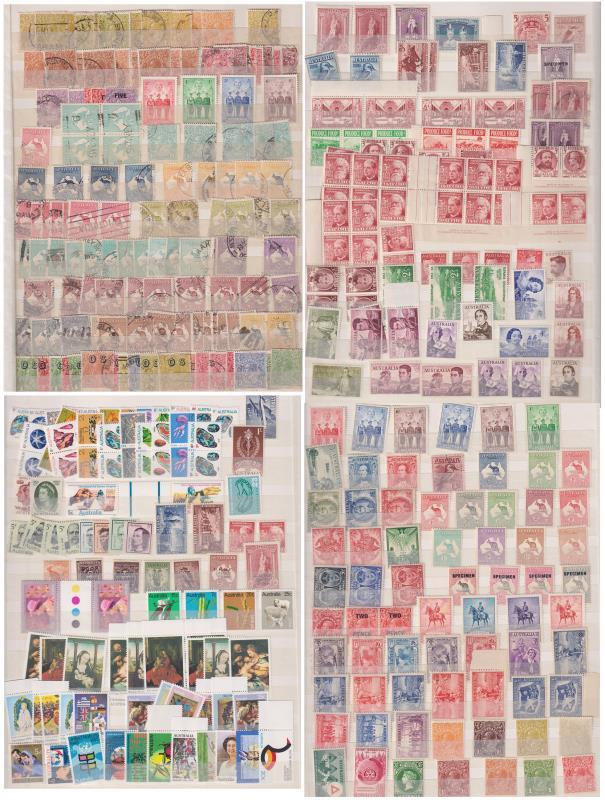 Australia 1913-71 mint & used colln on a few Hagners. Noted: used Roos to 10/- (+ £2 fiscal large punch hole); good range GV Heads to 1/4d mint; some useful key 1930s commems, 1940 AIF set in irregular block of 7s MUH; Coat of Arms to £2 mint; some officials etc. Several hundreds. (Image)