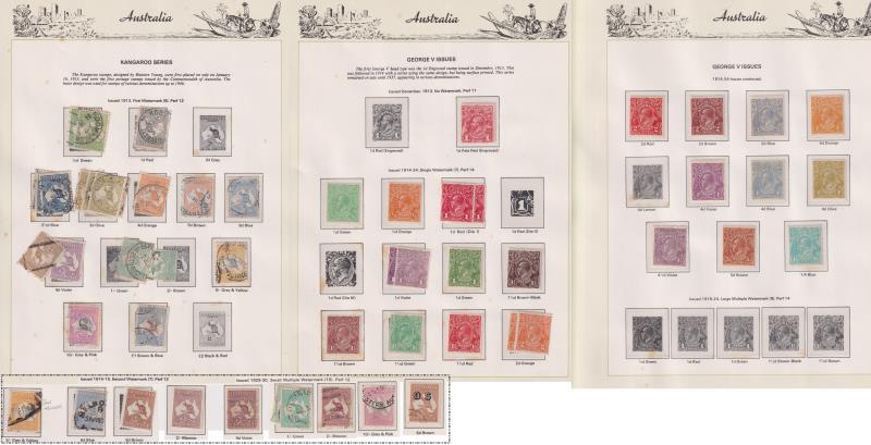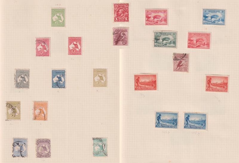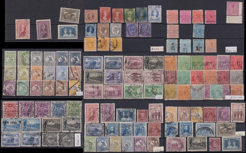 Australia 1913-40s mostly used seln on 18 small stockcards. Incl some useful 1930s commems, good seln Roos to 5/- & GV Heads. Also a few States (some mint) on 4 cards. Good cv. (Image)
