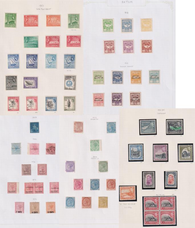 British Commonwealth c1870s-1960s seln nearly all mint specialised on pages. Countries incl: Aden & States (100+): Batum (19): Brunei (49): Burma (71): Cyprus (90) noted 1928 50th Anniv to 45pi (9v), 1935 SJ set, 1948 SW set, 1938 Picts set; Gibraltar (50); Maldives (22); Mauritius (120), noted 33 QV; Pakistan (115+); Bahawalpur (20); Seychelles (60+); Sudan (85), noted 1951 Picts set & TDC (10). Total 800+ stamps. (Image)
