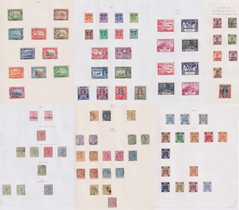 British Commonwealth c1890s-1960 specialised seln nearly all used. Countries incl: Aden, Brunei, Burma, Cyprus, Gibraltar, Malta, Mauritius, Pakistan, Palestine, Seychelles, Sudan etc. About 1250 stamps. Mostly part sets but noted some sets, eg: Cyprus 1938 Picts. (Image)