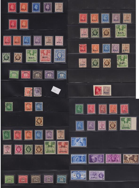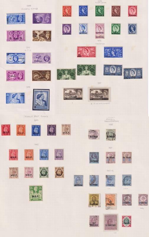 British Countries ovpts c1885-c1960 mint & used specialised collns on pages: Bahrain (80 stamps), Kuwait (80), Eastern Arabia (78), TransJordan (not ovpt, 30+), Occupation Italian Colonies (70), British Levant (25), Morocco Agencies (about 150), Tangier (85) & Qatar (40). Nice range, some useful items. Total about 650 stamps. Good cv. (Image)