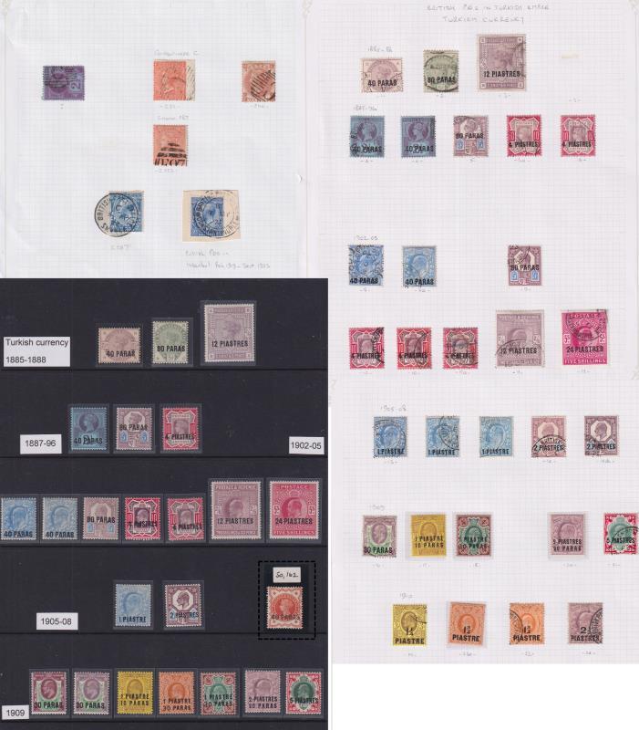 British Levant c1880-1921 mint & used colln on pages used (identified by SG No's) & Hagners (mint). Noted used: 6 GB stamps used in Constantinople etc; 12pi & 24pi EVII; 45pi; 90pi, 180pi Seahorses. Mint: 1885 80pa & 12pi (both good colour); 12pi & 24pi EVII; 40pa on ½d vermilion (SG 7, small crease, BPA cert 1998); 1913-4 GV set of 6; Levant 1905 EVII set of 10 with chalk vars ; 1921 45pi (2 shades), 90pi & 180pi Seahorses; 1921 Levant GV set of 7. Total 165 stamps. High cv. (Image)