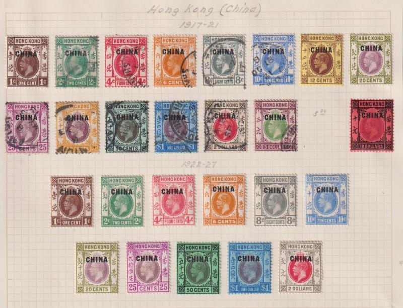 British POs in China 1917-27 stamps of Hong Kong with CHINA ovpts: wmk mult crown CA mixed mint & used set of 16 (no $5) incl $2 GU/FU, $3 FU & $10 mint (cv £700), wmk mult script CA set of 11 mint. SG cat £1623. (Image)