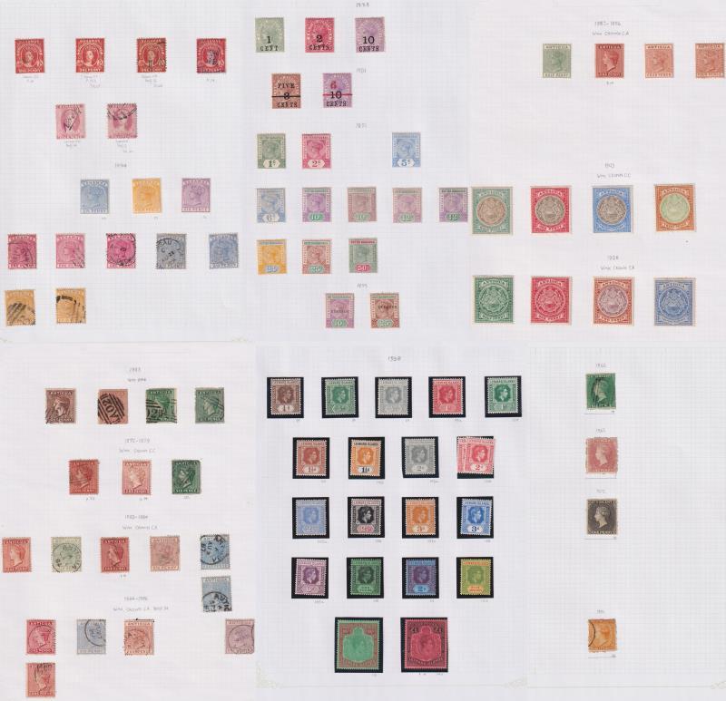 British West Indies c1860s-c1960s mint & used specialised colln on pages - some stamps identified by SG No etc. Incl: Antigua (130+ stamps) noted 18 QV used, 1938 Picts set mint. Bahamas (about 300), noted QV x 16, GV x 5/- x 2, GVI 5/- & £1 mint (both patchy gum), 1942 Columbus set FU, 1964 New Constitution set FU. British Guiana (185) noted 1898 Jubilee set mint. British Honduras (90) noted 1891 QV values to 50c incl 25c mint. Caymans (80+). Dominica (100) noted 1938 & 1951 Picts set mint. Grenada (140+) noted 1938 Picts set mint. Leeward Isl (70+) noted 1938 GVI set mint. Montserrat (68). St Lucia (75). St Vincent (about 150), noted 1938 Picts set mint. Trinidad/T & T (200+). Turks & Caicos (140+) noted 1950 Picts set mint & 1960 £1 mint. Although many short defin sets incl most 1935 SJ sets mint & other Omnibus sets plus interesting specialised WWI War Stamp issues. (Image)
