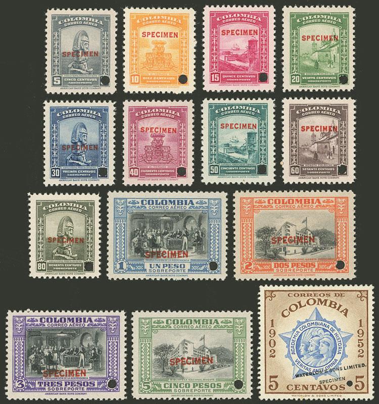 Yvert 128/140, 1941 complete set of 13 values with "SPECIMEN" overprint and punch hole, MNH. We also include a proof of 1954 of Yvert 491 (History academy), in colors different from the original, with SPECIMEN overprint and also punch hole (mint without gum), excellent quality, very good lot! (Image)