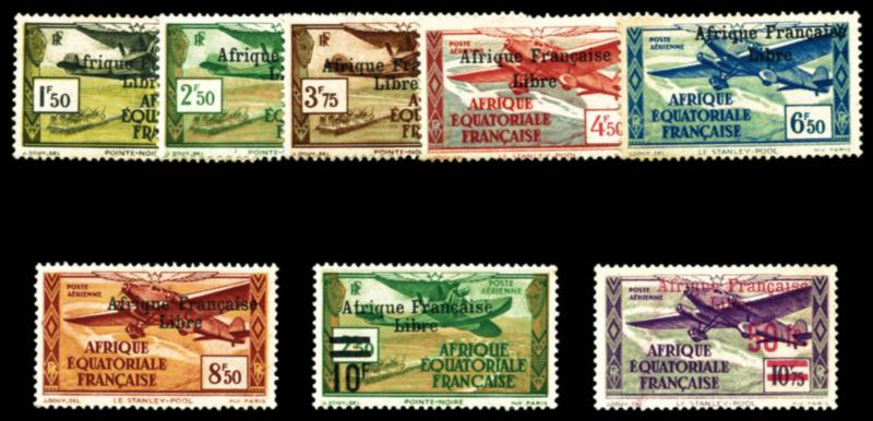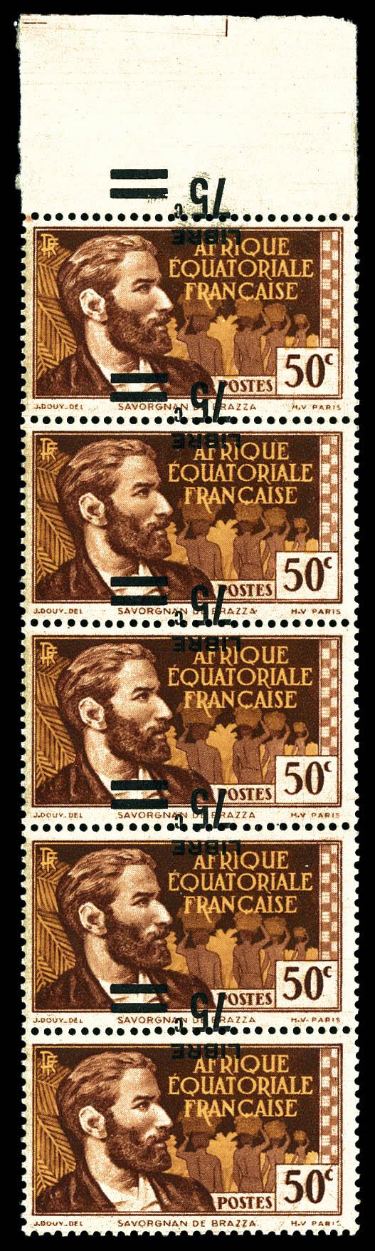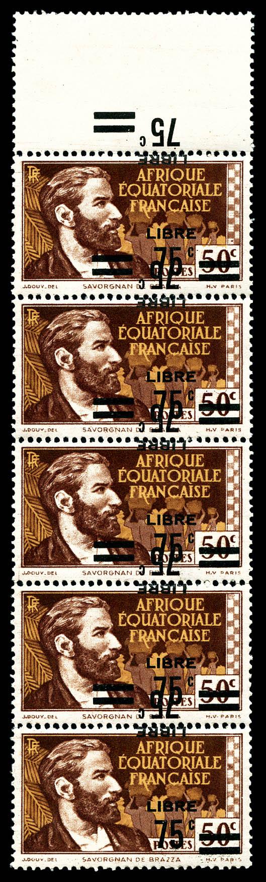 N°139, France-Libre. Surcharge renversée et à cheval en bande verticale de 5 exemplaires cdf dont un timbre sans surcharge, gomme coloniale, SUPERBE. R. (certificat) Qualité: ** (Image)