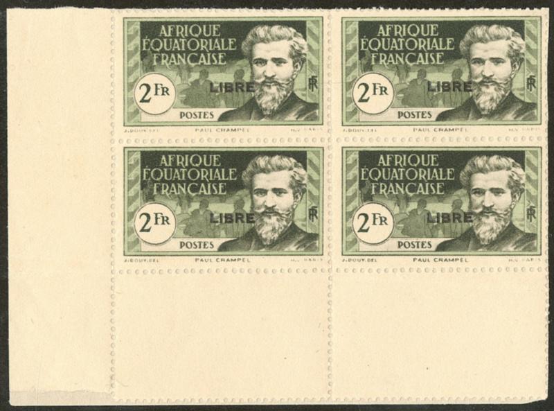 France-Libre. Non émis. 2f noir et vert (Maury 122B), bloc de quatre cdf, pos. 16-17/21-22, collés sur un support. - TB. - R (tirage 25, cote Maury : 11000 €) (Image)