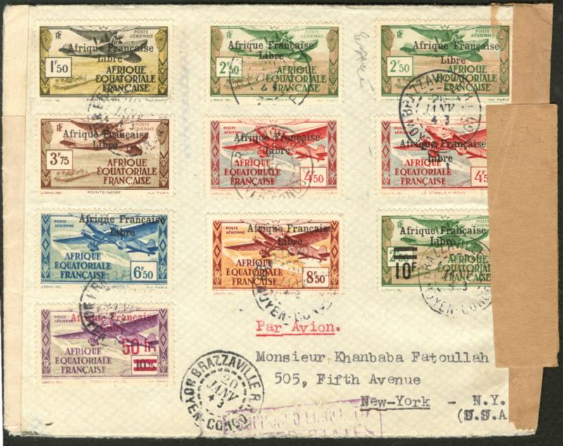 Poste Aérienne. France-Libre. Nos 14 + 15(2) + 16 + 17(2) à 21 sur enveloppe recomm. de Janv 43 avec censure pour New-York, les 15, 17 et 19 sont surch. espacée. - TB (Image)