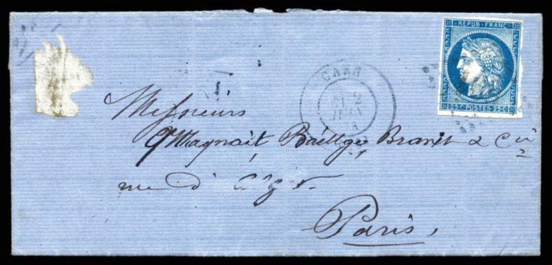 N°23, 25c bleu obl GC 691 + càd de CAEN sur lettre non taxée de 1873 pour PARIS, exceptionnelle utilisation d'un timbre des colonies générale en métropole. TTB. R. (certificats) Qualité: Oblitéré (Image)