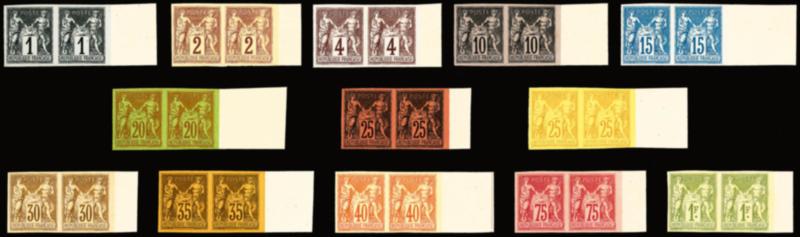 SAGE, Tirage spécial de 1900 sur Bristol, on ne connait que 2 panneaux de 25 timbres découpés: 13 valeurs differentes en paires bord de feuille latéral, RARE et SUPERBE (certificat) Qualité: (*) (Image)