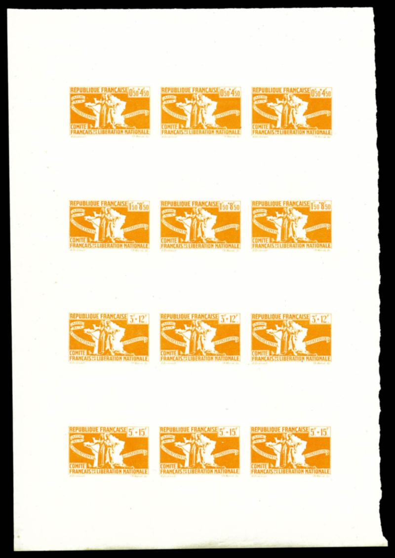 FRANCE LIBRE N°1 à 4: Pour l'aide aux combatant, épreuve collective en jaune-orange sur feuillet gommé. SUP. R. (certificat) Qualité: ** (Image)