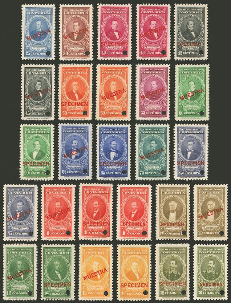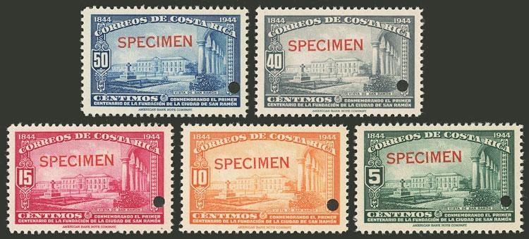 Yvert 224/228, 1944 Centenary of the city of San Ramón, complete set of 5 values with SPECIMEN overprint and punch hole, VF quality! (Image)