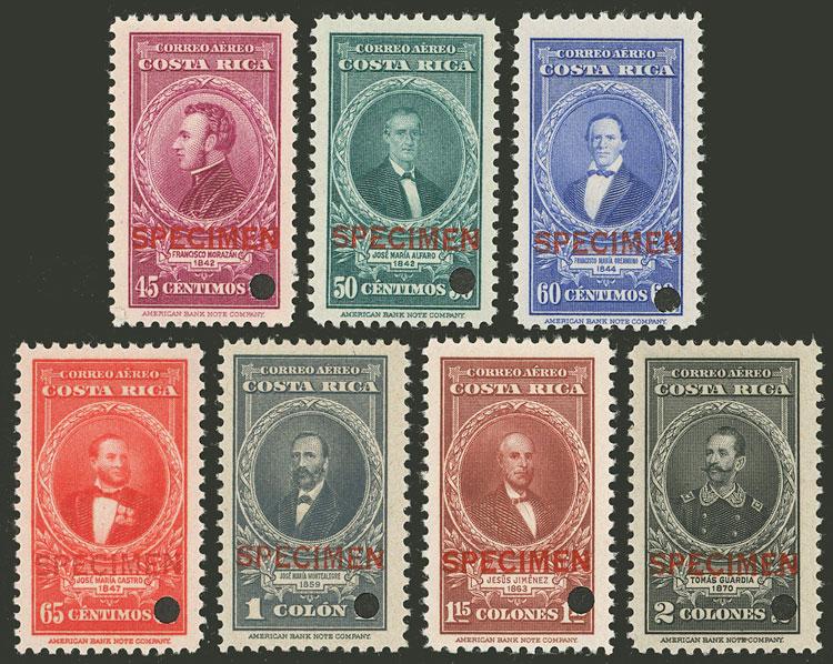 Yvert 73 + other values, 1943 Próceres, 7 values of the set with SPECIMEN overprint and punch hole, MNH, excellent quality! (Image)