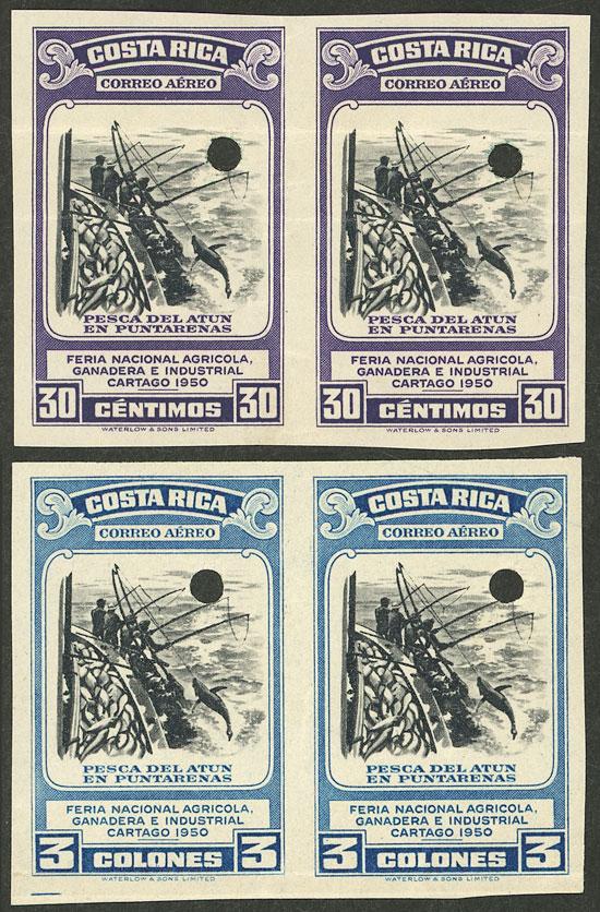Yvert 201 + 207, 1950 Tuna fishing 30c. and 3C., IMPERFORATE pairs with punch hole (specimens), with light creases, very nice! (Image)