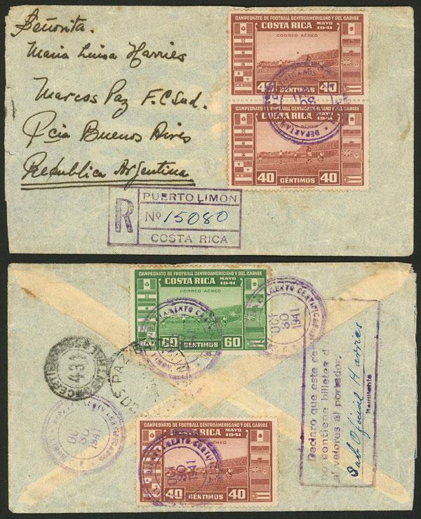 30/OC/1941 Puerto Limón to Argentina, registered airmail cover franked with stamps of the "Central American Football Championship" issue, total 1.80C., and arrival backstamp of Marcos Paz 4/NO, very attractive! (Image)