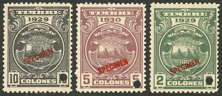 3 Revenue stamps of 1929 and 1930 (high values of 2C, 5C and 10C) with SPECIMEN overprint and punch hole, excellent quality! (Image)