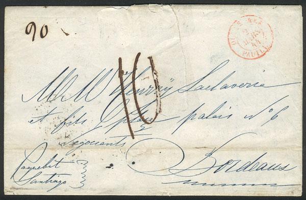Entire letter dated Santiago de Cuba 25/JA/1844, sent to Bordeaux (France) via steamer Santiago, with interesting marks on front and back. With a repaired cut, excellent appearance, good opportunity at LOW START! (Image)
