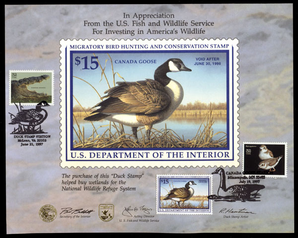 Card 93,RW64 1997 Canada Goose full color souvenir card with First Day cancel, VF, with June 21, 1997 Duck Stamp Station postmark, also a July 19, 1997 Minneapolis MN postmark most likely from the 1997 Minnesota Stamp Expo. Condition is very good to excellent, tiny corner crease upper left Cat($45) (Image)