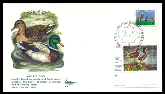 CD1,Canada 1985 Mallard with tab on FDC, VF, unaddressed, Gill Craft cachet, pristine condition (Image)
