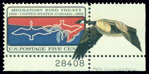 1306R,5ยข Migratory Bird Treaty, Lower Right PNS #28408 with color remarque of Canada Geese in Flight, sba of remarque by Ken Michaelsen (deceased), XF NH (Image)