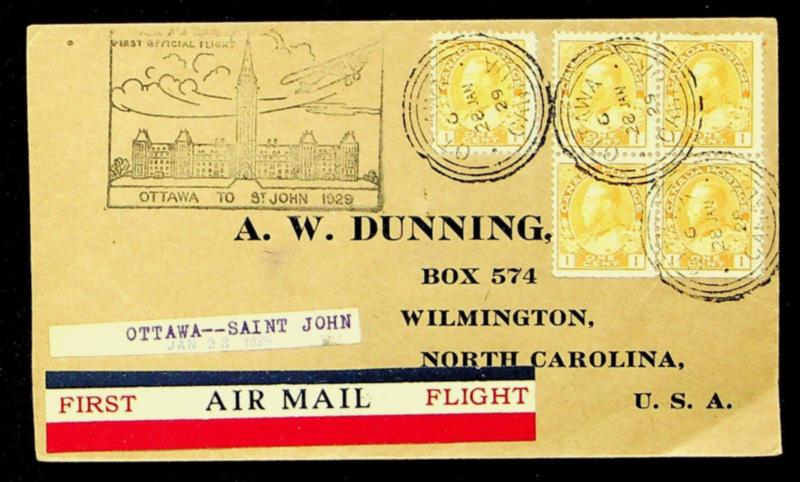 Canada 1929 KGV 1cx5 on First Flight Airmail Ottawa-St. John cover to Wilmington NC USA (Image)