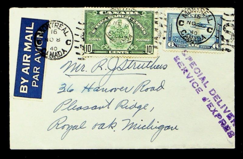 Canada 1940 WWII Special Delivery Express Airmail cover from Montreal to Royal Oak Michigan USA w/ "MOUNT ROYAL HOTEL" logo on flap (Image)