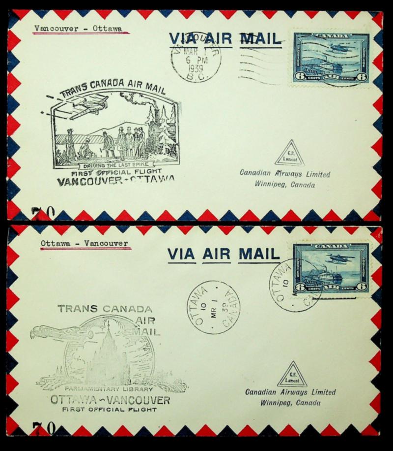 Canada 1939 2 First Flight Airmail Vancouver to Ottawa & return covers to Winnipeg (Image)