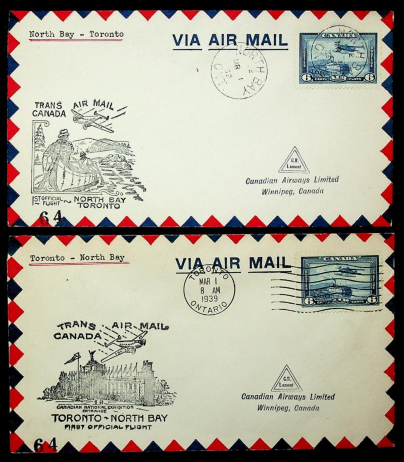 Canada 1939 2 First Flight Airmail North Bay to Toronto & return covers to Winnipeg w/ 6cx2 (Image)