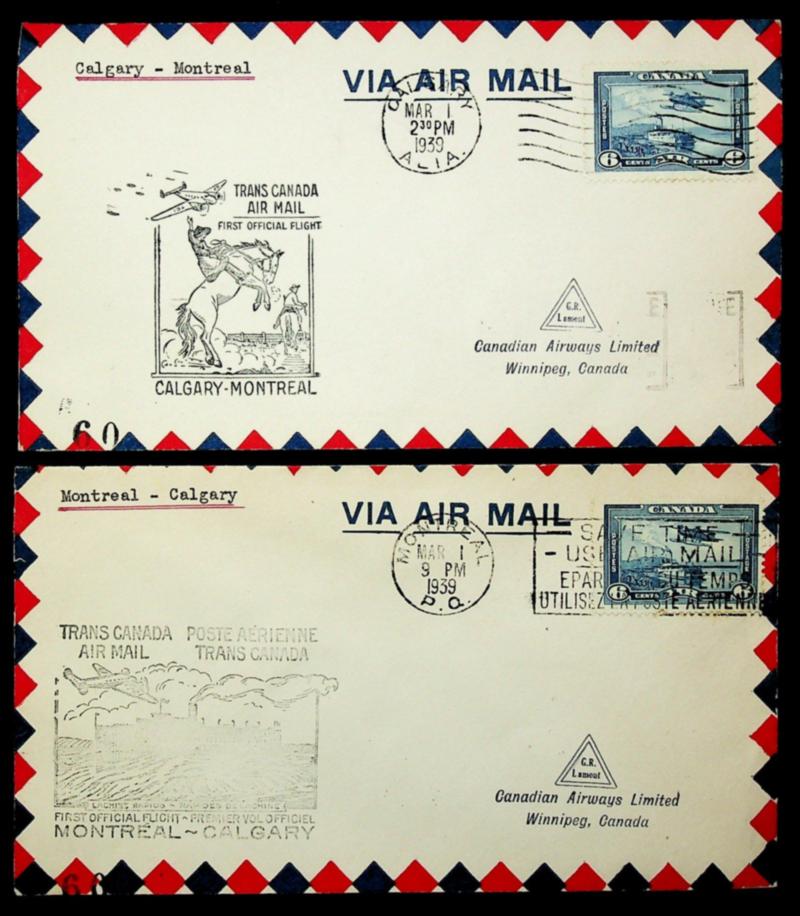 Canada 1939 2 First Flight Airmail Calgary to Montreal & return covers to Winnipeg w/ 6cx2 (Image)