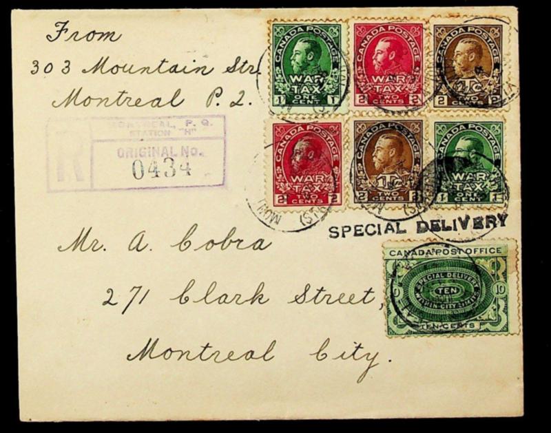 Canada 1926 KGV 6v War Tax+ 10c Special Delivery Regd cover sent within Montreal (Image)