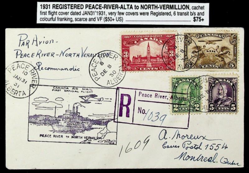 Canada 1930-31 4v on First Flight Airmail Peace River-North Vermillion cover, Regd to Montreal (Image)