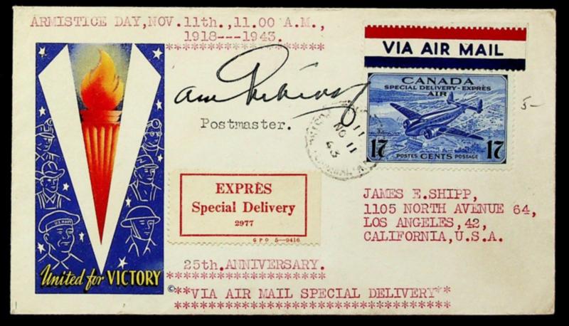 Canada 1943 WWII "V" Victory, Armistice Day Special Delivery Express Airmail, P/M signed cover w/ 21c to USA (Image)
