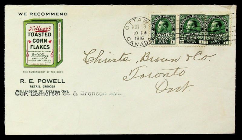 Canada 1916 WWI KGV War Tax 1cx3 on Kellogg's Corn Flakes advertising cover from Ottawa to Toronto (Image)