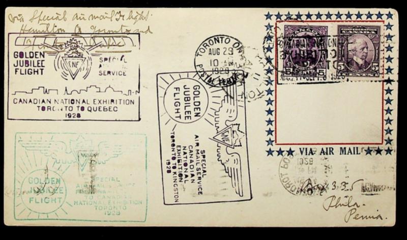 Canada 1928 5c pair on Golden Jubilee Flight Special Airmail National Exhibition cover from Hamilton via Toronto/ Quebec to Philadelphia USA (Image)