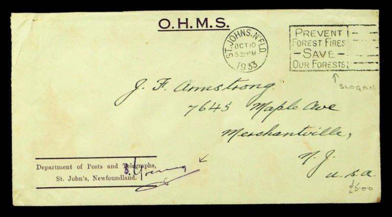 Newfoundland Canada 1933 OHMS Official signed cover w/ slogan cachet from St. Johns to USA (Image)