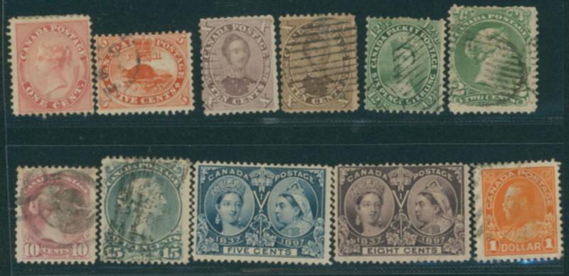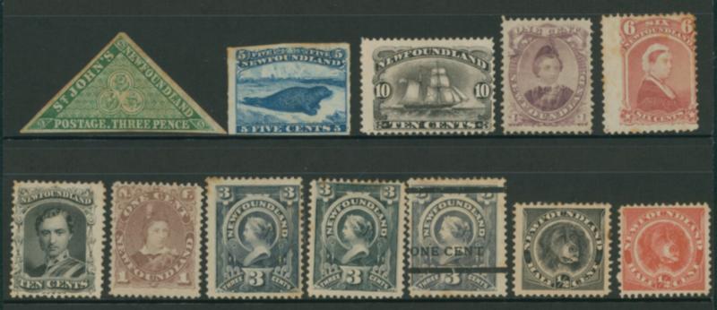 Newfoundland 1860-1897, 12 stamps 1860 3p, 1865 10c, 1868 1c, 1876 5c,1887 0.5c 10c, 1897 1c on 3c, and etc unused dirty surface, stained, hinged, scissor cut, catalog value:170,000YEN (Image1)