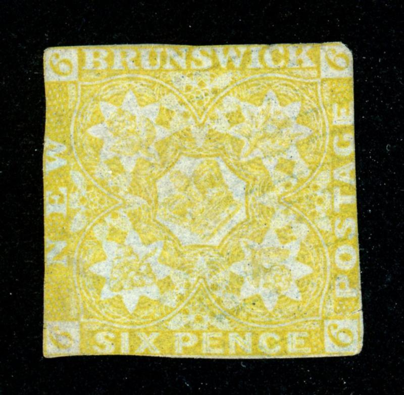 New Brunswick Scott 2 Used, 6d Olive Yellow - 1851 issue on blue paper. Little to no margins, with some edge faults. Good spacefiller. (SCV $1200) (Image)