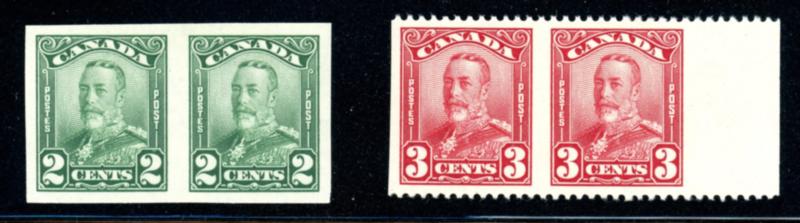 Canada Scott 150b, 151b MH VF Imperfs KGV, 1928-29 - King George V imperf pair and imperf between pair. Nice margins, MH. (SCV $200 as MH) (Image)