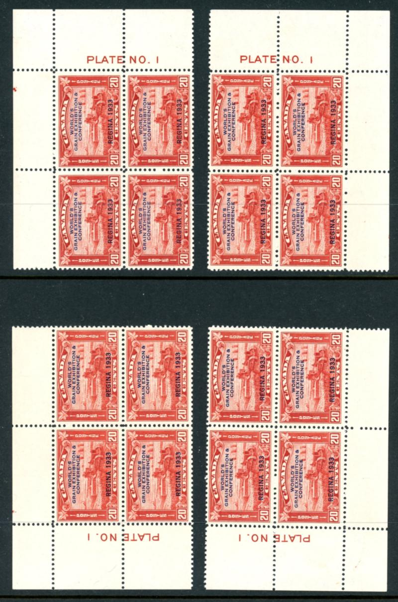 Canada Scott 203 Matching Plate Blocks MH F-VF, Grain Expo Overprint 1933 - All plate #1 blocks. Nicely centered, previously hinged but a few just in selvage. (UTC $1200) (Image)