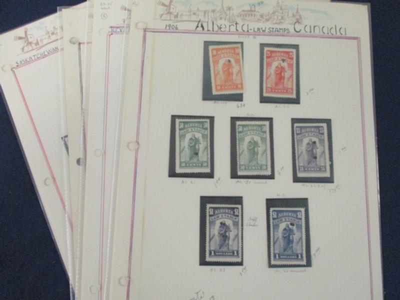 Canada Revenue Accumulation on Pages - About 40 revenues, mostly used from Alberta and Saskatchewan, and includes a Wayzata stamp. Adding some interest, there are also Cinderella material like a set of the Cannington Manor overprints and colorful lily overprints on the Saskatchewan Law stamps. (Est $50-60) (Image)