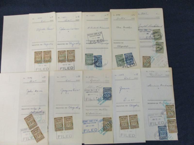 Canada Saskatchewan Law Stamps on Documents - Apparently 1930-40's law stamps on district court requisition documents. Typically VanDamme SL45//56 high values. About 120 documents. (Est $100-200) (Image)