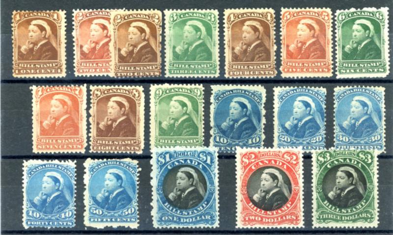 Canada VanDam FB37-FB54 Complete, 3rd Bill Issue - 18 different, unused, some no gum. Orange stamps are oxidized. Scattered flaw but generally fine or better. (VanDam $338) (Image)