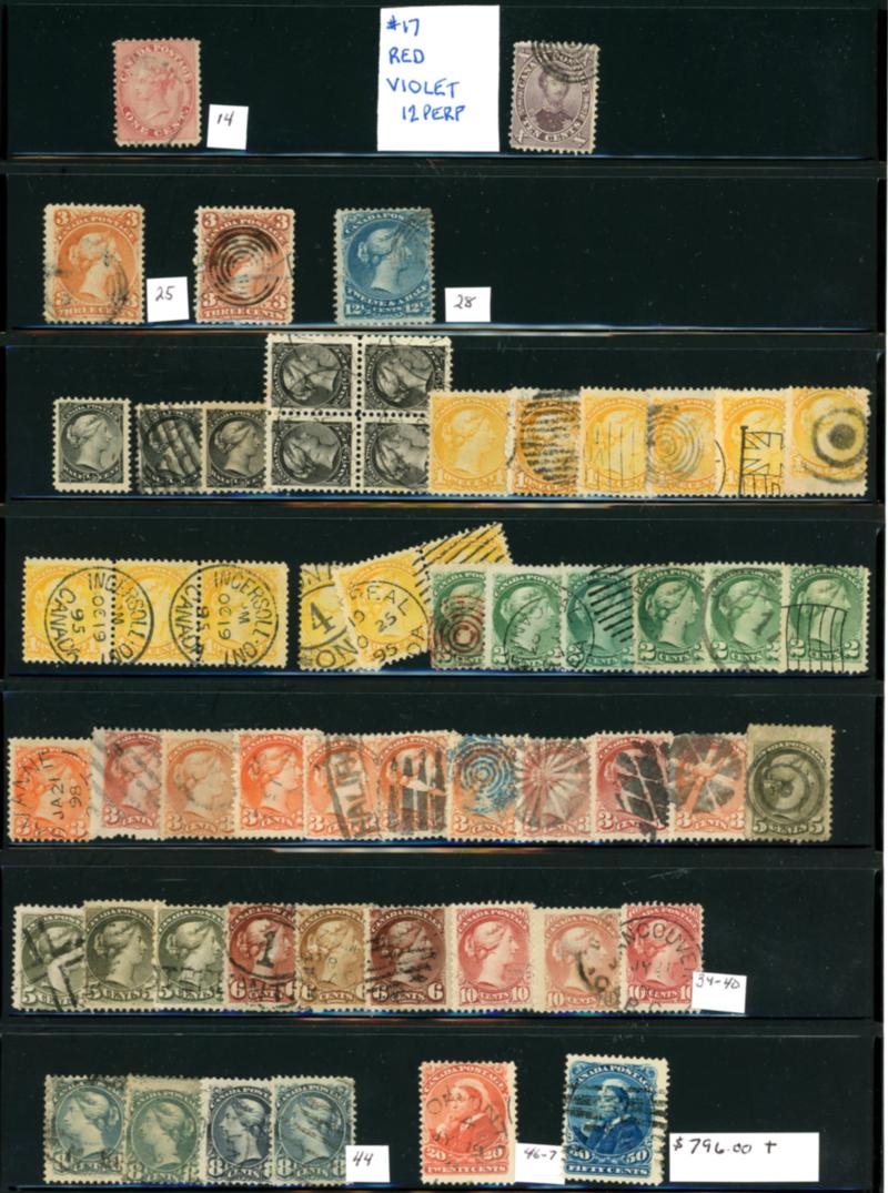 Canada Vintage 19th Century Used Accumulation - An accumulation of around 200 used stamps between Scott 14//30 with a majority being large Queens. There is mixed condition and centering varies from avg to VF. 2023 SCV is about $22K which was calculated at lowest price, so shades and watermarks need to be reviewed as SCV will likely be higher. Although there are many nice copies and duplication, expect some faults. Everything as scanned. (Est $3000-4000) (Image)