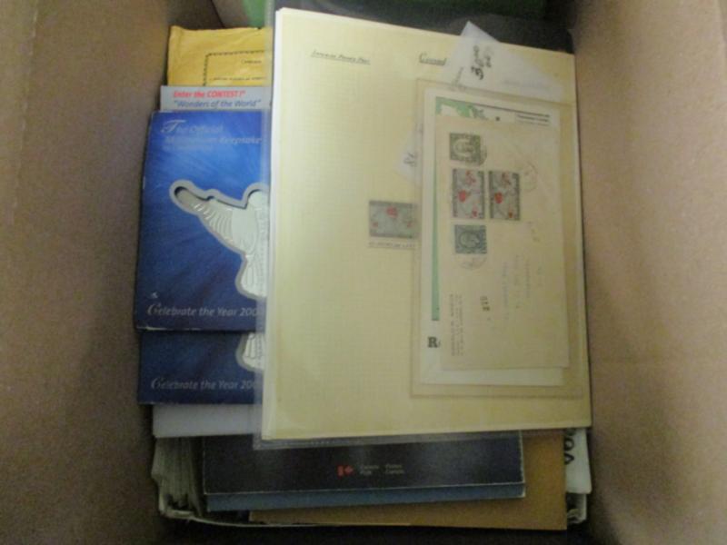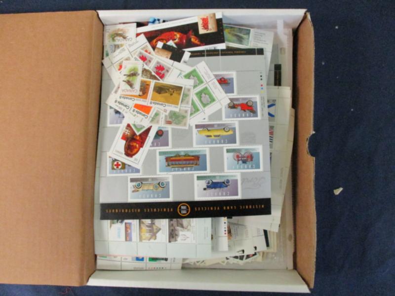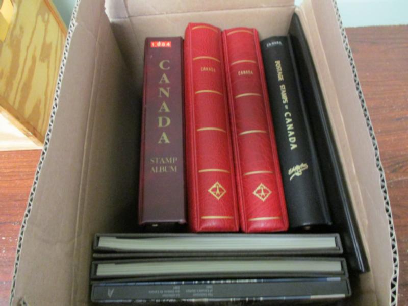 Canada in 2 Banker Boxes with Album, Stockbooks, Etc - Much to go through in 2 boxes filled with albums, stockbooks, smaller boxes, and a few large envelopes. Mostly used with occasional pockets of unused. We spotted a small grouping of unused Scott 85-86, Lindner binder 1968-74 with used SON cancels, collections of OHMS perf-ins, shoebox of used, old postcards, some revenue stuff, another Lindner binder of KGVI used with many SON cancels, A shoebox of booklets with some better as well as Wildlife booklets (1985-2007, 2010, $189 face). Expect duplication and some faults. Could be fun! (Est $350-450) (Image)