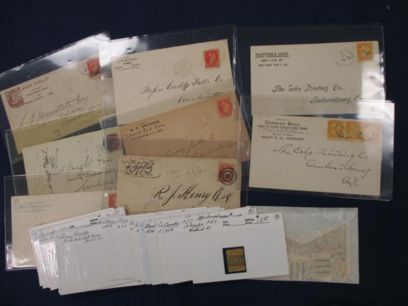 Canada Small Queens Stamps and Covers - 3 part lot: 1. Dealer cards with a nice selection of Scott 35//45 mostly selected for cancels, 2. A glassine with likely 100x Scott 35 pre-cancels which may be of interest for shades, and 3. 8 diff advertising corner covers with Scott 35 or 37. Generally fine or better, but expect a few faults. (Est $150-200) (Image)