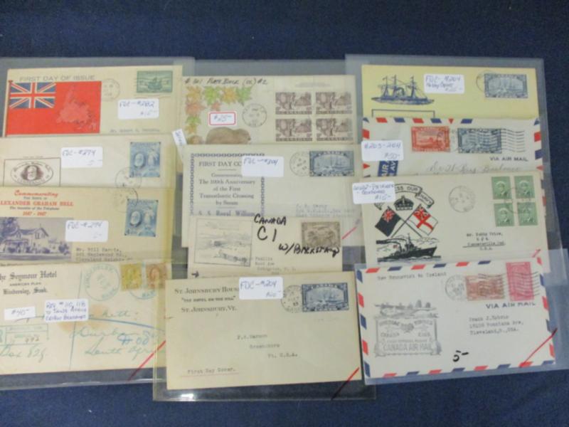Canada Cover Accumulation - Group of 43 covers, from 1920-60's era. Mostly first days, then several first flights, and one registered and WW2 patriotic. All optimistically priced from $5-50 (over $400 total) and ready for your retail stock. Generally F-VF. (Est $100-150) (Image)