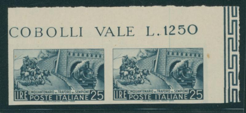 Italy 1956 25L Imperf. pair Plate proof unused stained, full original gum, (Image1)