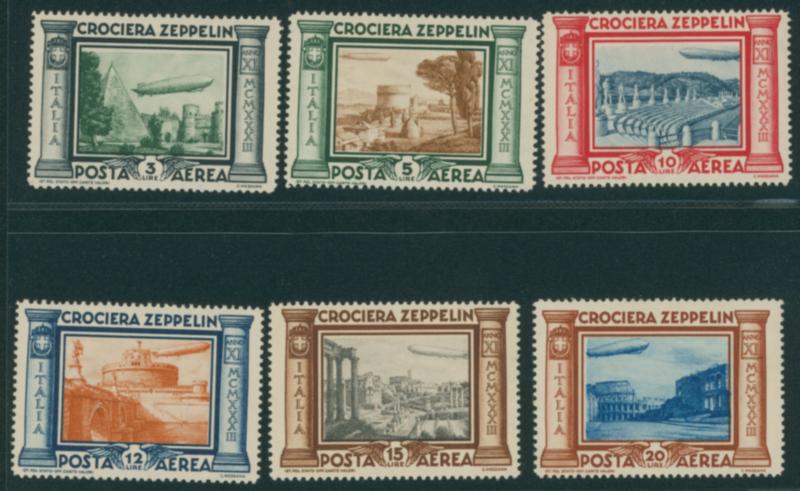 Italy 1933 3L - 20L Zeppelin airmail stamps 6 examples unused stained, full original gum, catalog value:50,000YEN (Image1)