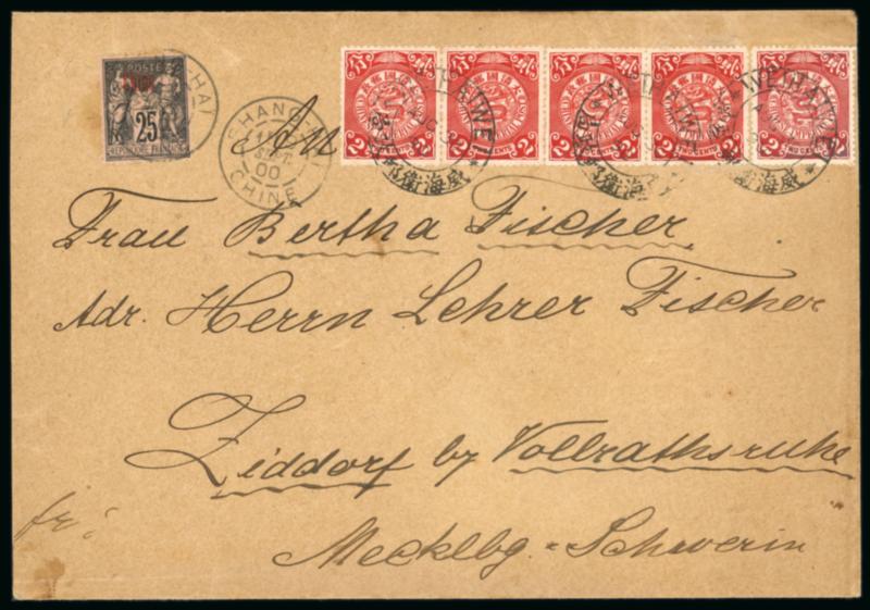1898, Coiling Dragon 2c deep red, very fine horizontal strip of five used on 1900 cover to Germany, all ti3d by bilingual WEI HAI WEI circular date stamps of 20 Aug. With France 25c with red CHINE overprint, paying onward transmission tied by Shanghai cds. Envelope with a slight trim at left, but a very attractive and scarce combination usage. (Image)