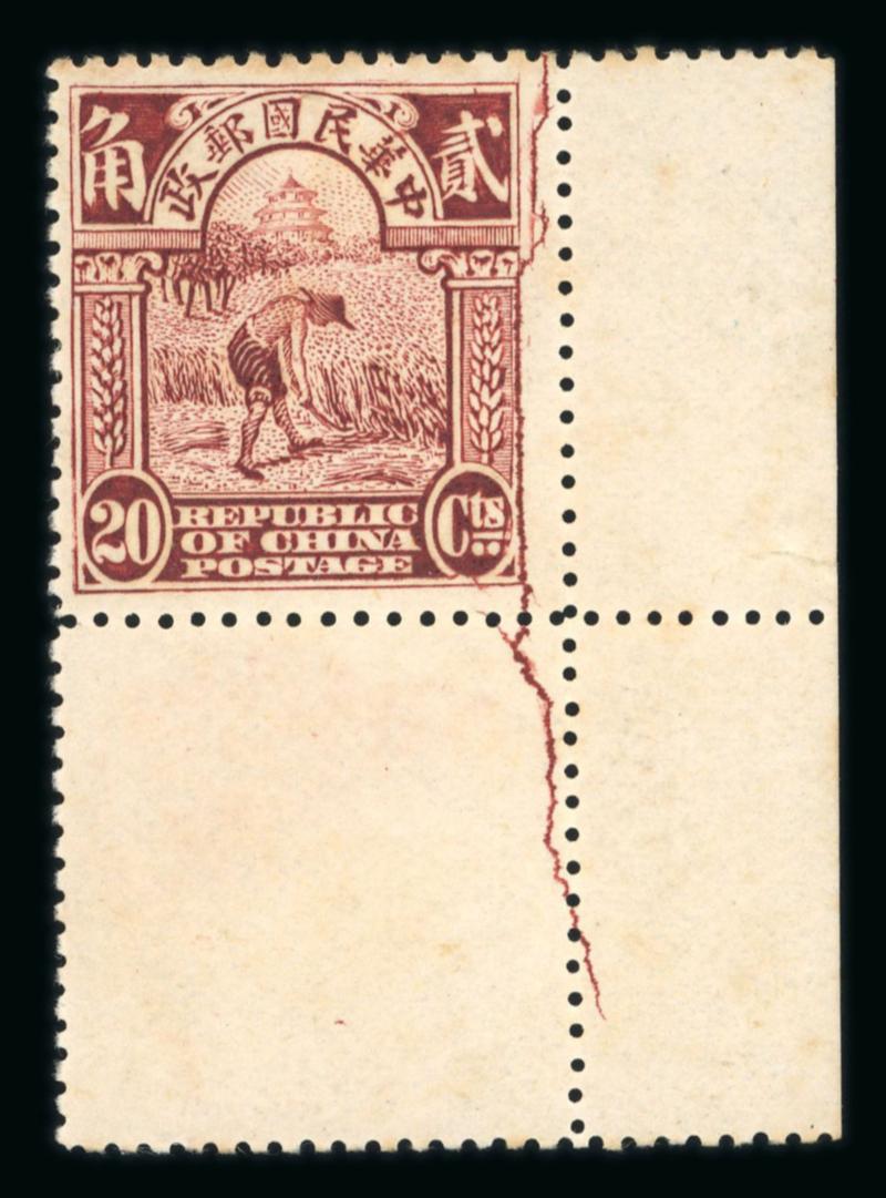 China 1913 London printing 20c Reaper, a bottom right corner marginal shoeing a spectacular plate crack which runs from top right of stamp, through the stamp and into bottom margin, a truly spectacular item, fresh hinged mint (Image)